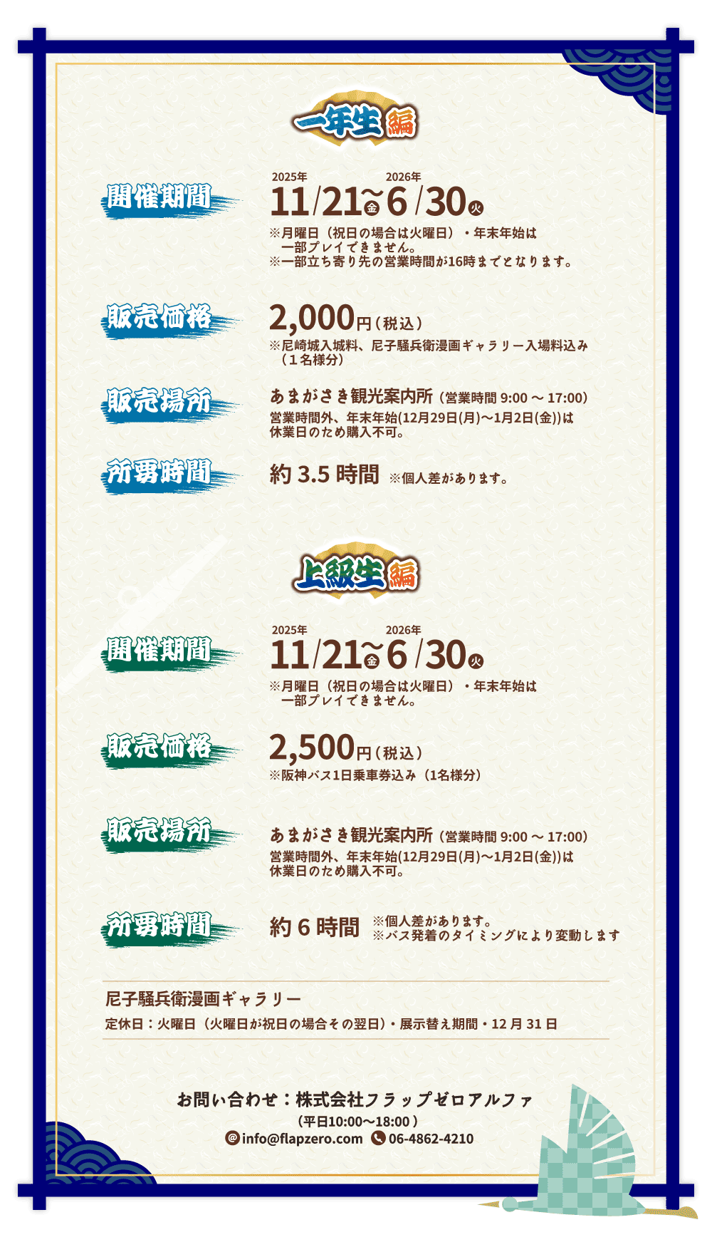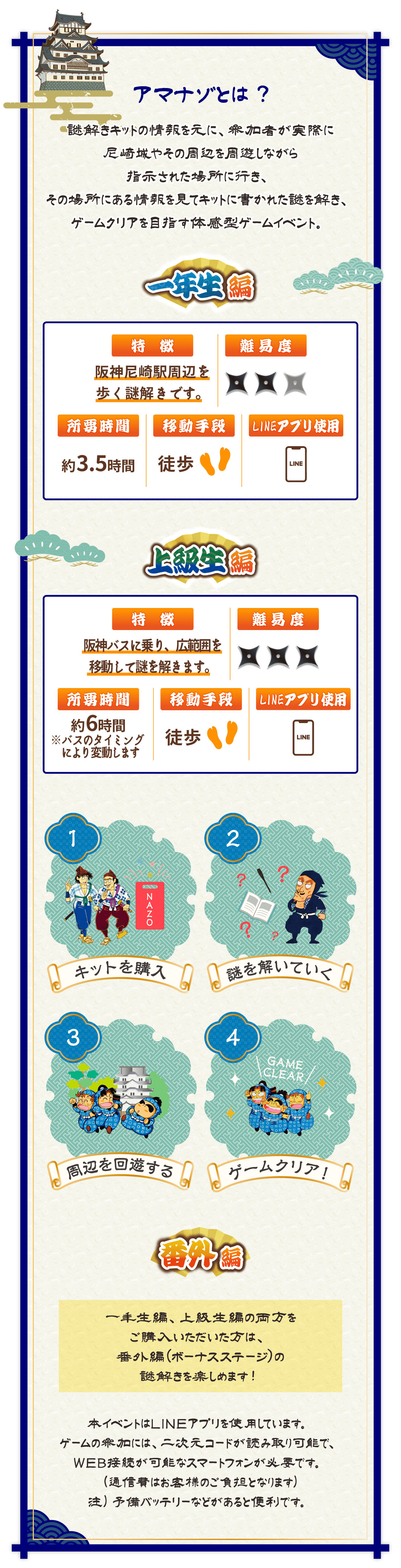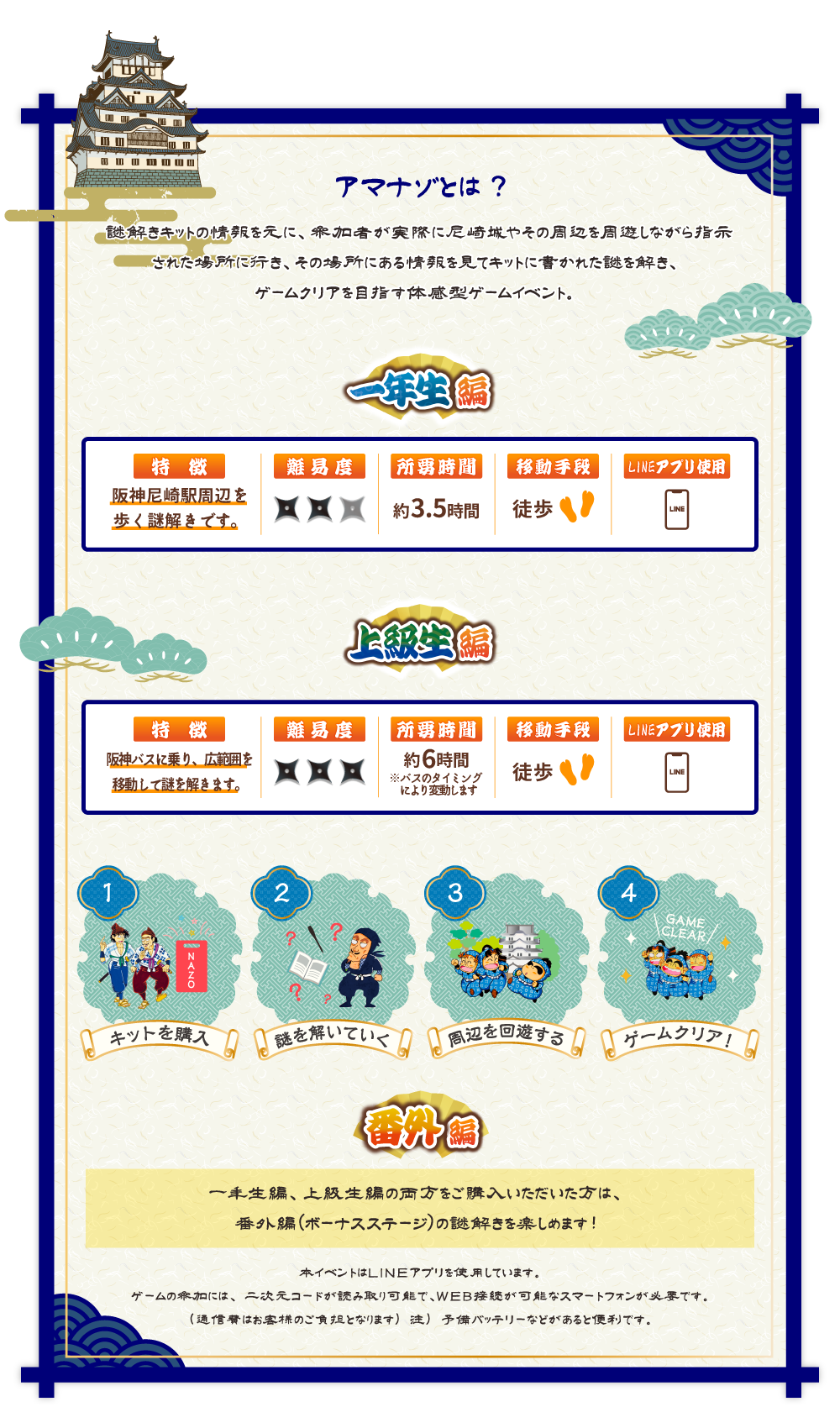 - クリアには時間がかかる場合もございますので、余裕を持って参加されることをお勧めいたします。複数日にわたってのプレイも可能です。ただし、尼崎城への入館は、当日のみ有効です。