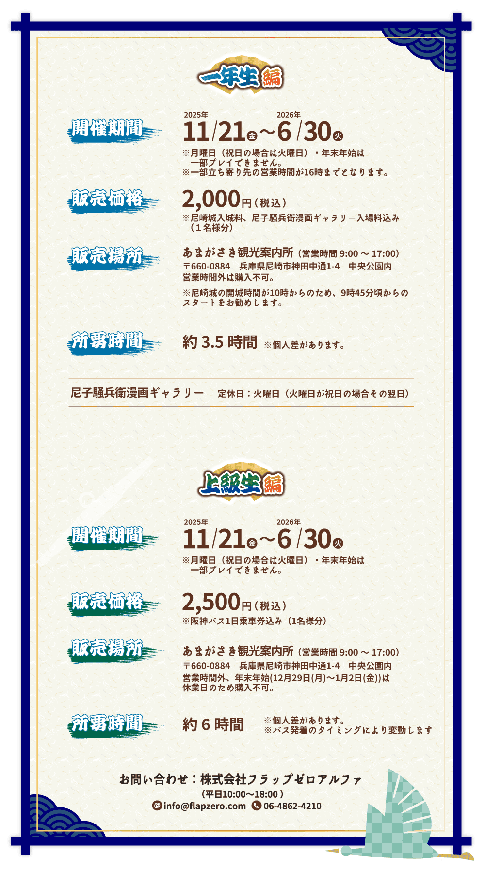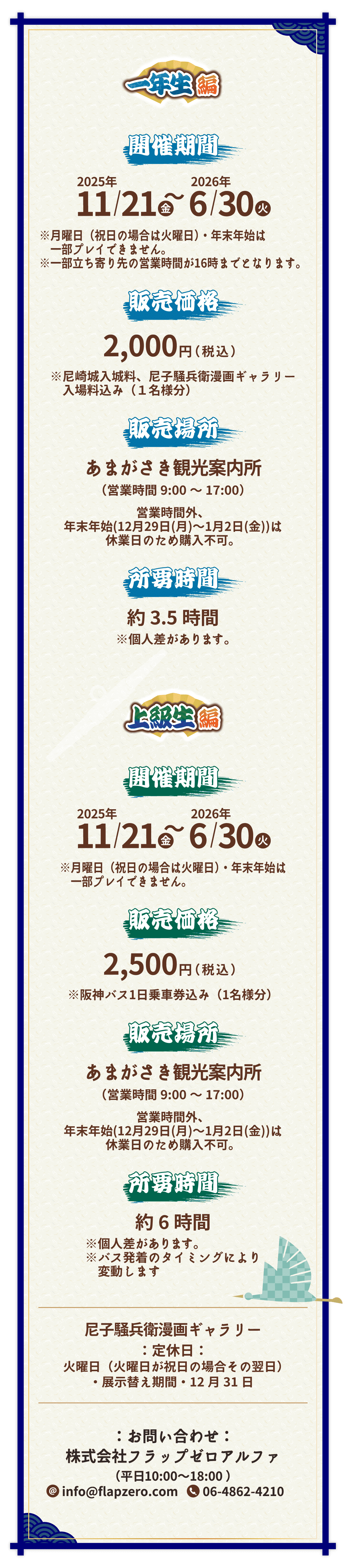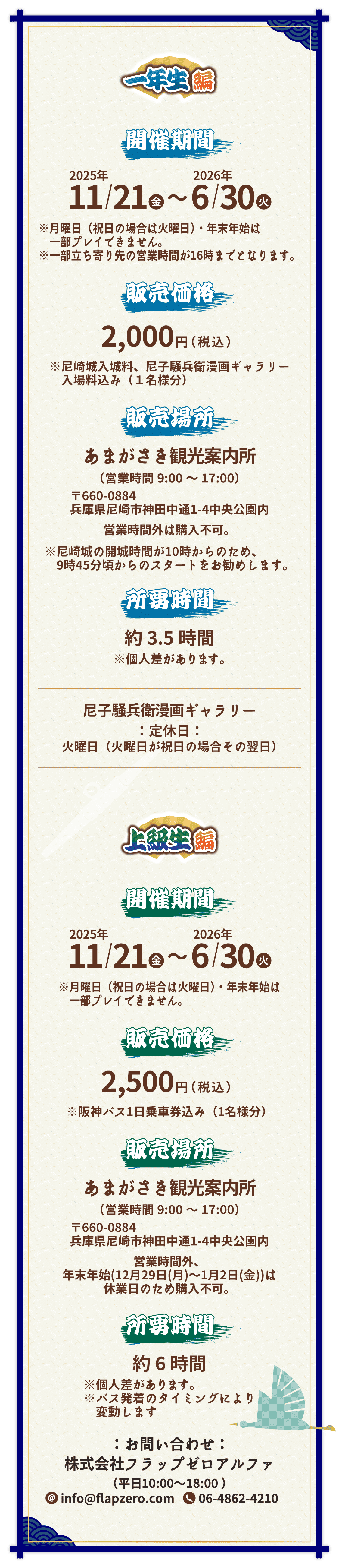 - クリアには時間がかかる場合もございますので、余裕を持って参加されることをお勧めいたします。複数日にわたってのプレイも可能です。ただし、尼崎城への入館は、当日のみ有効です。