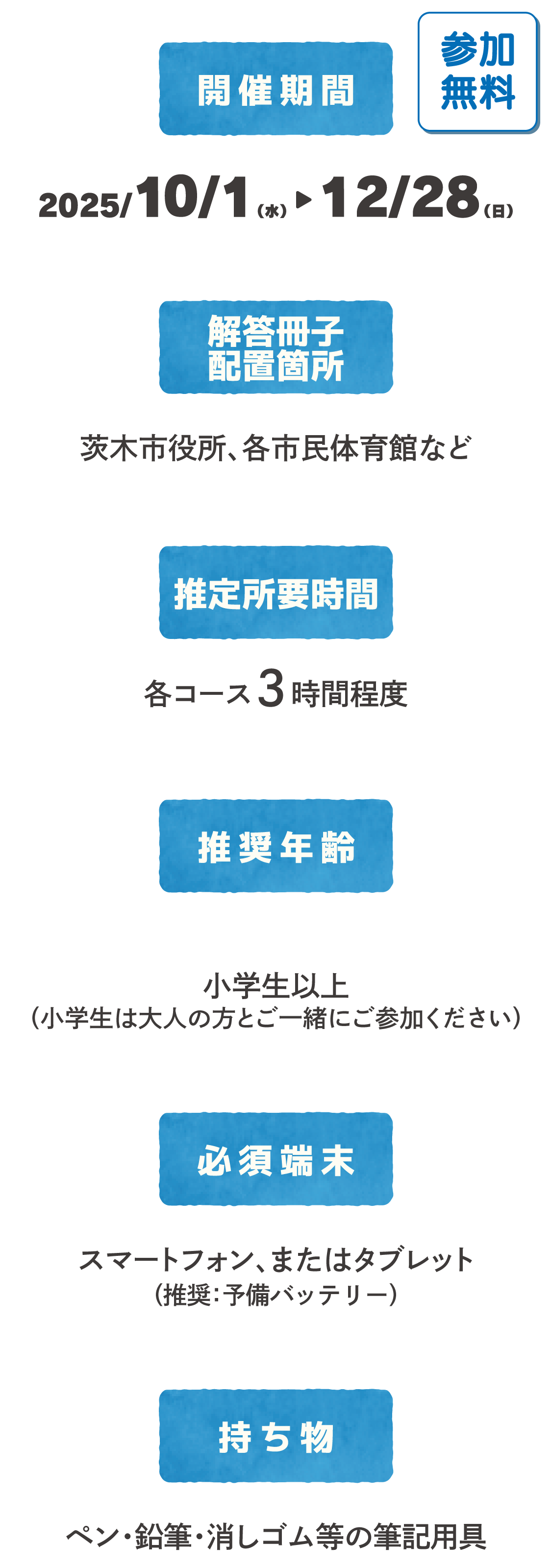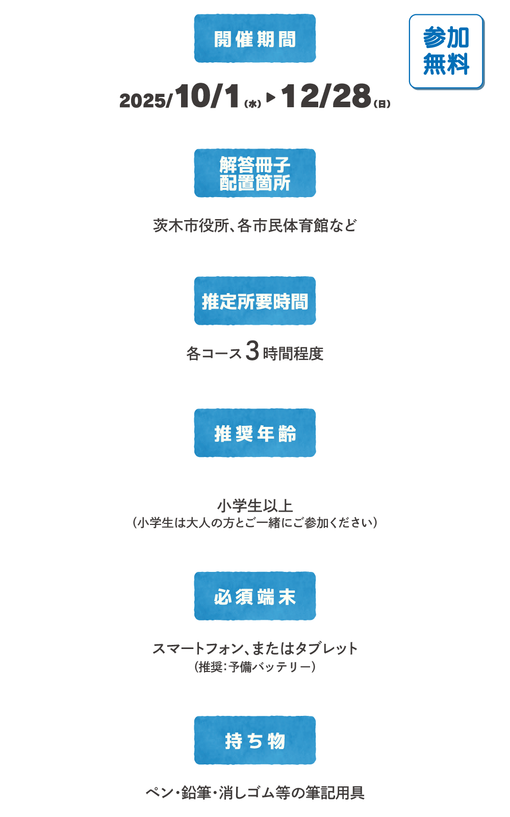 - 本イベントの謎の問題、解答、配布物をブログやSNSなど、インターネット上で公開すること、譲渡や転売することは固くお断りいたします。(イベントの感想などは大歓迎です)