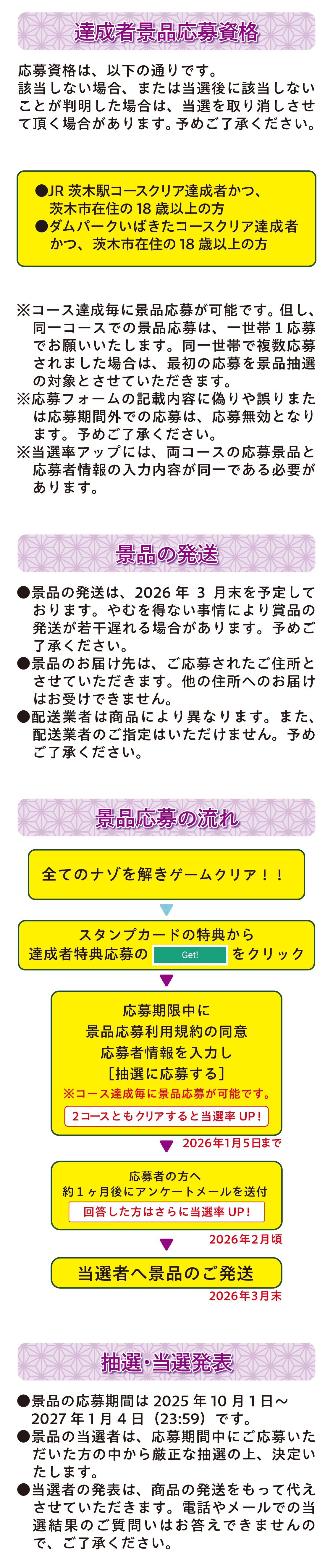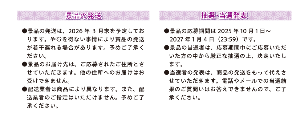 - 景品の抽選過程及びその結果に関する問い合わせには一切お答えいたしかねますので、ご了解ください。
