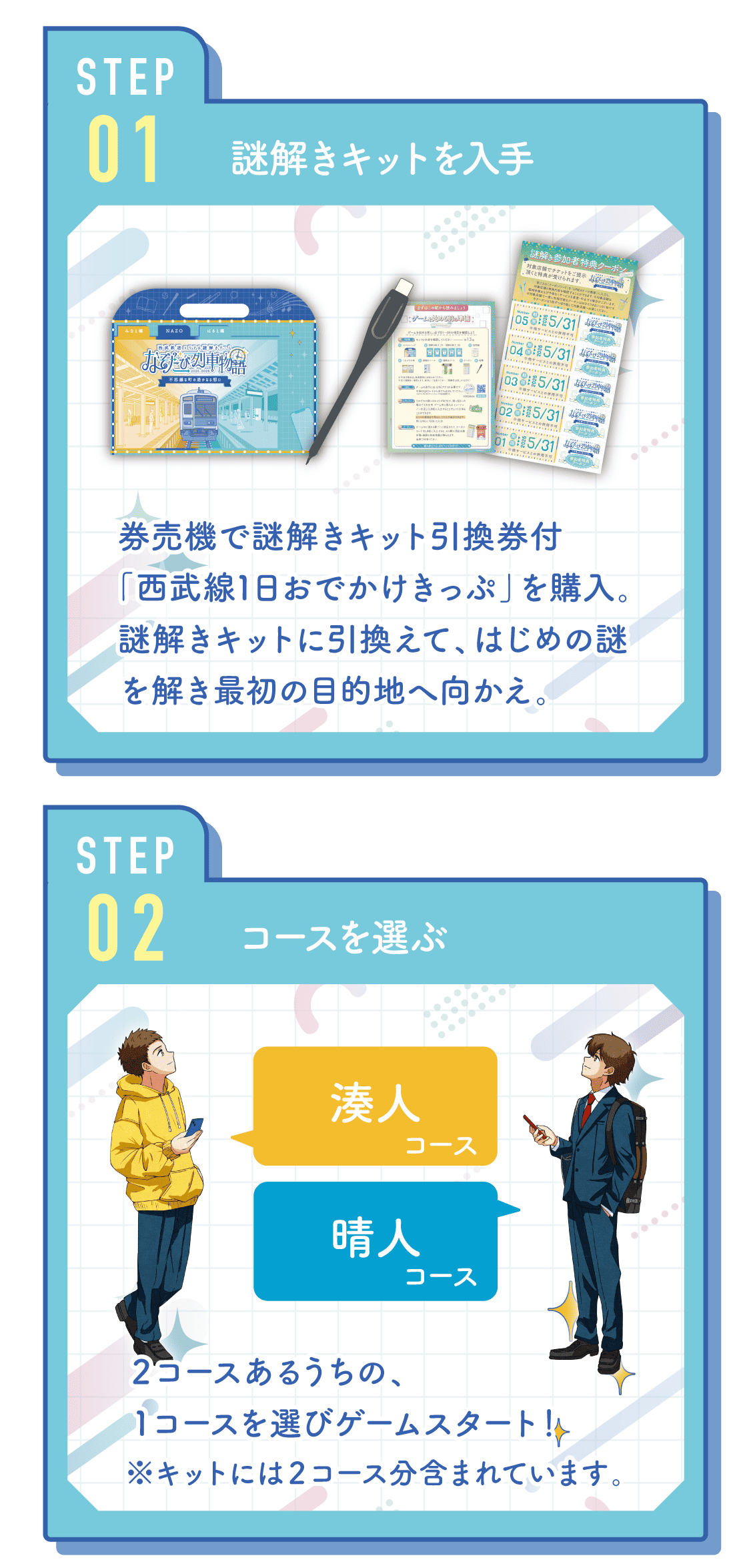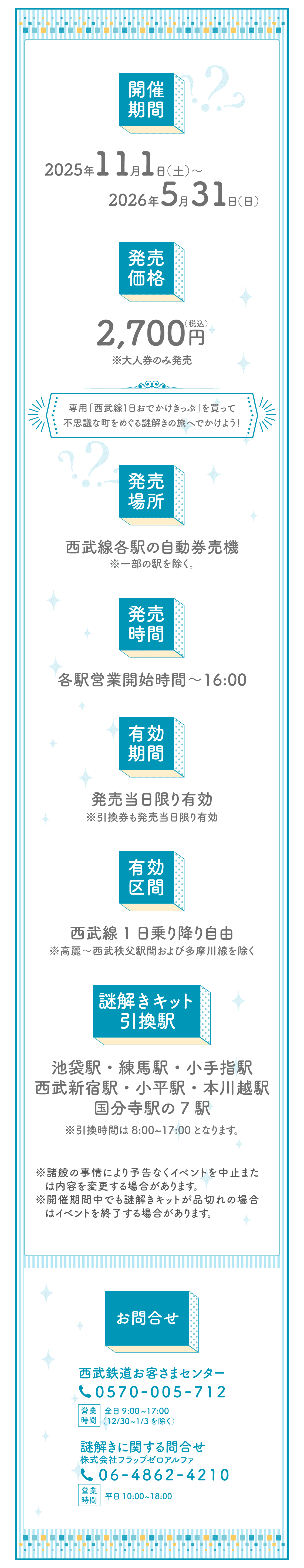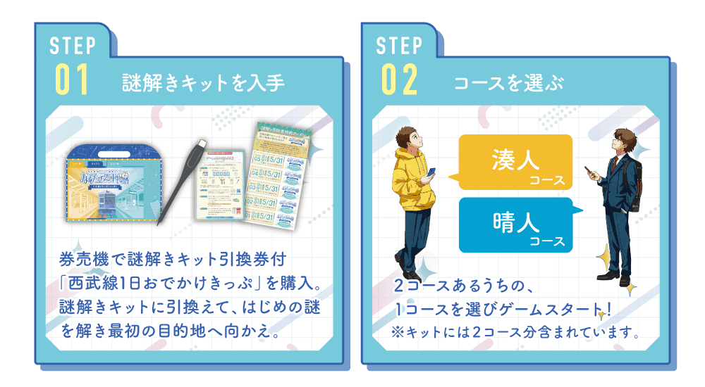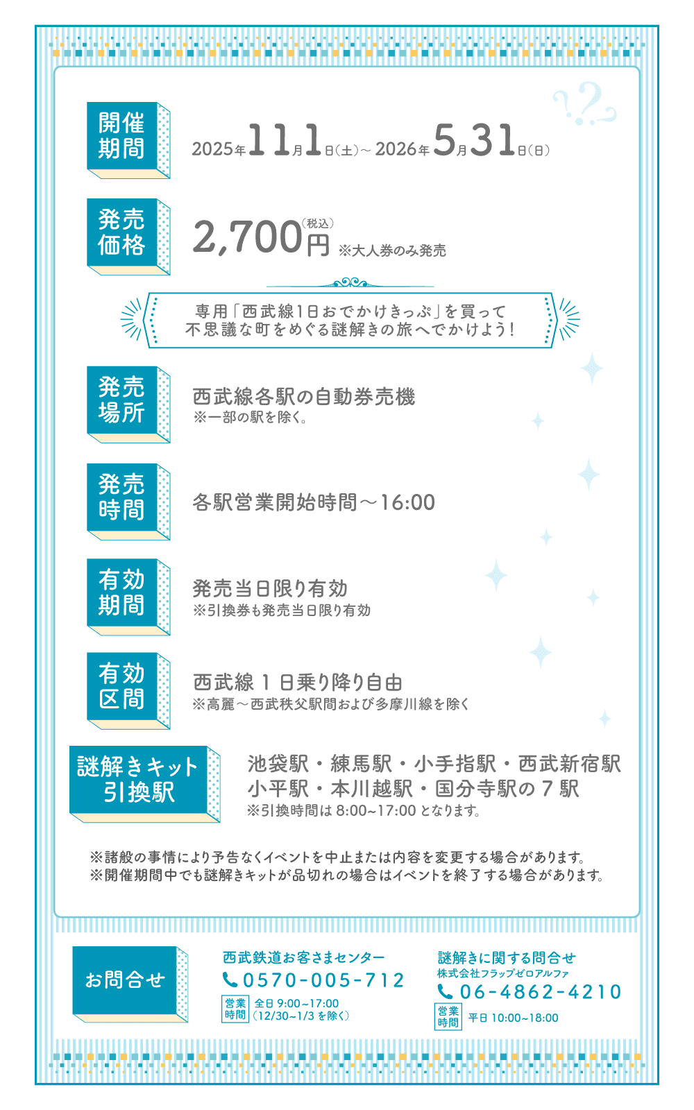 - 西武線1日おでかけきっぷ、謎解きキット引換券および謎解きキットを紛失された場合、再発行はできません。