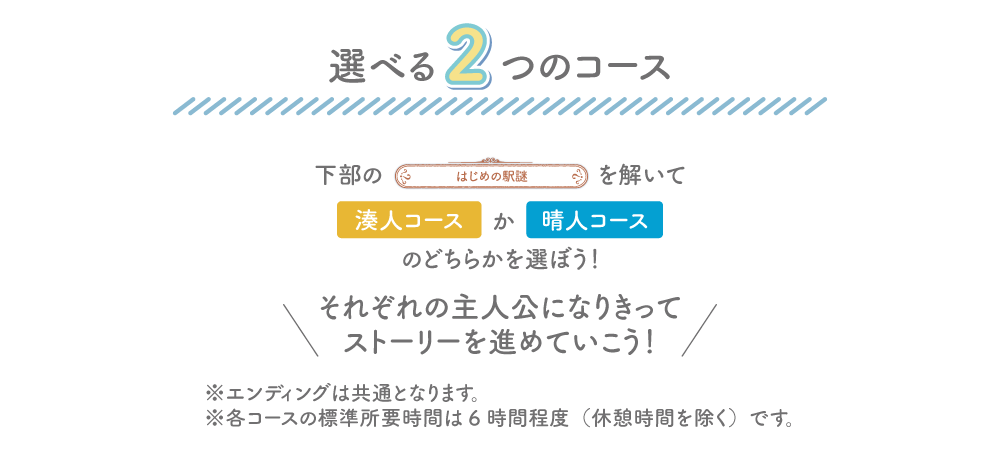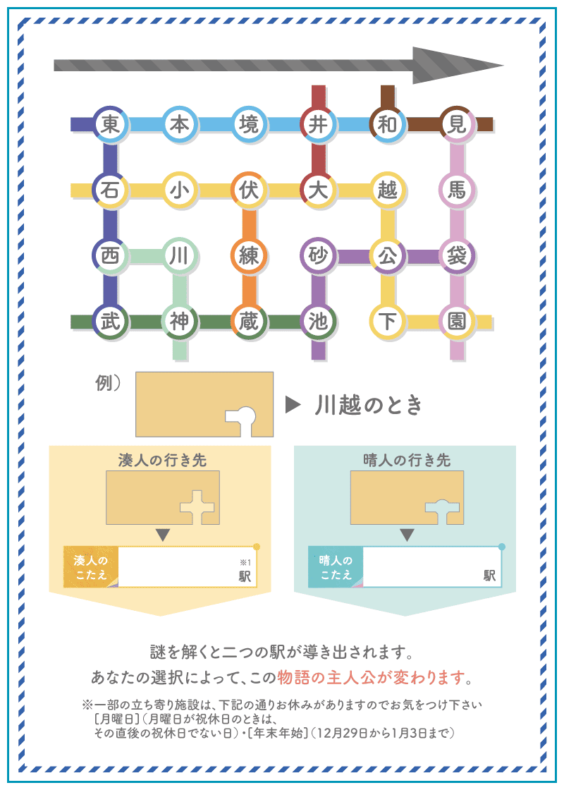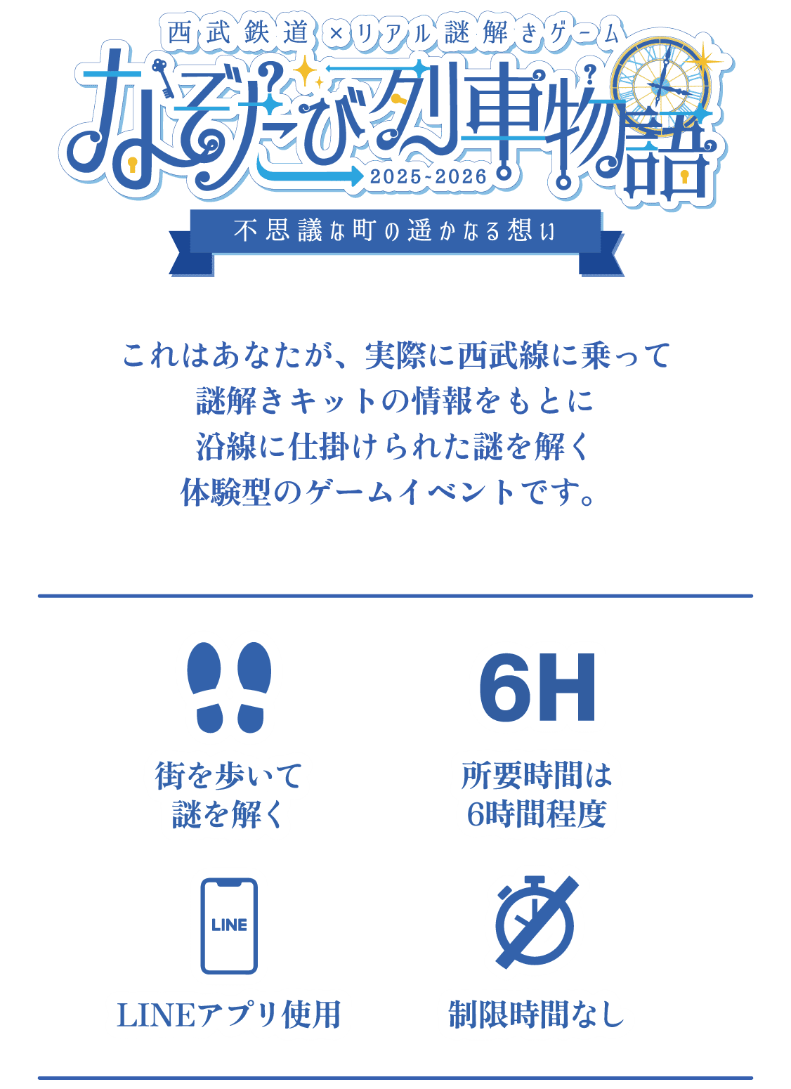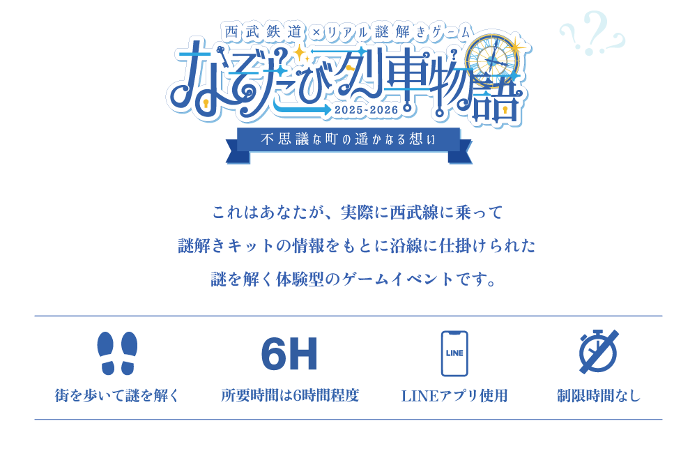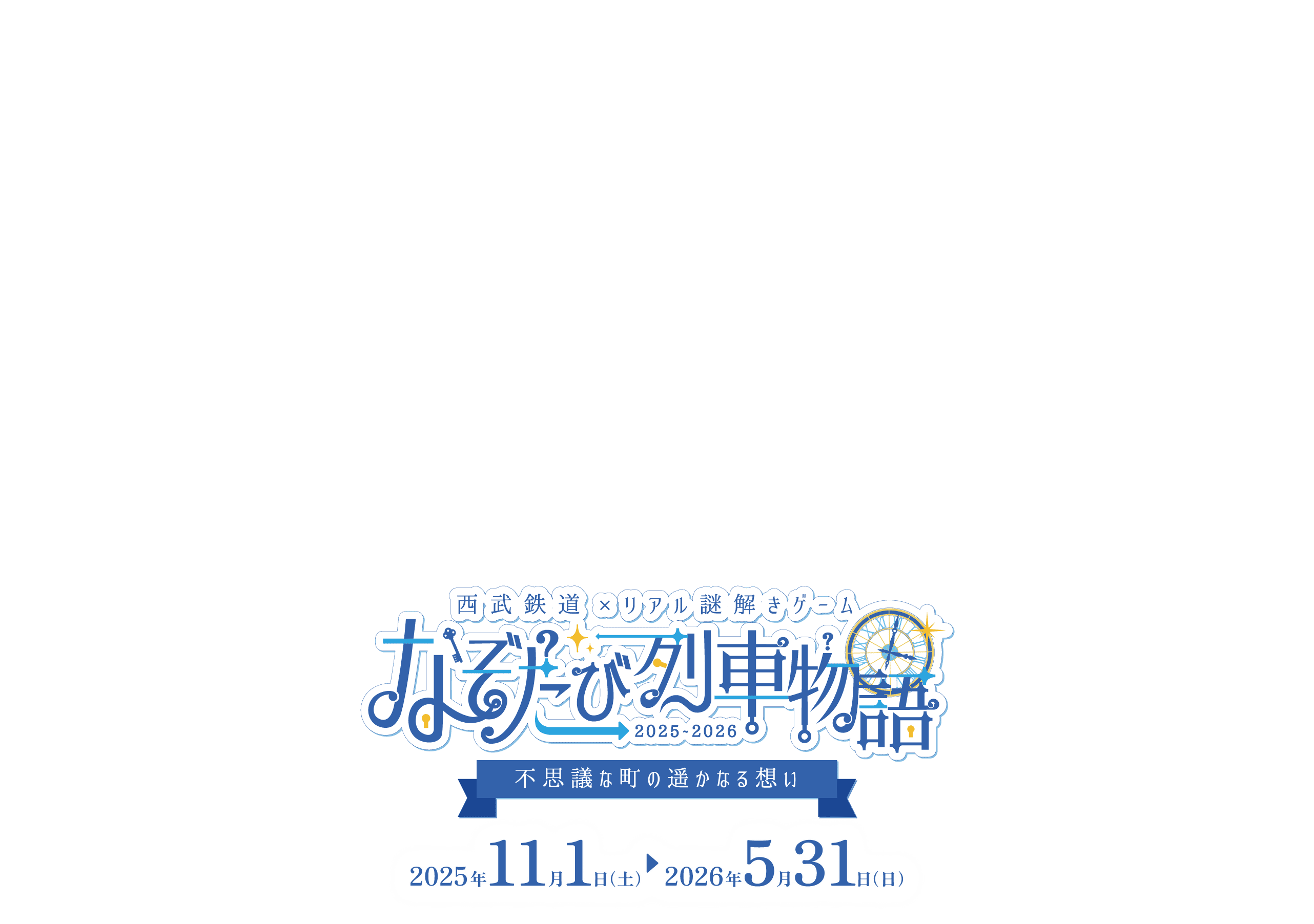 - ゲーム参加中、ホームや駅構内を歩行の際は安全に十分にお気をつけください。また、他のお客さまのご迷惑になるような場所での謎解きはご遠慮ください。