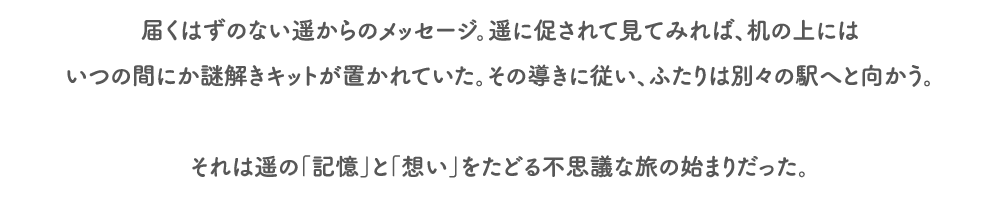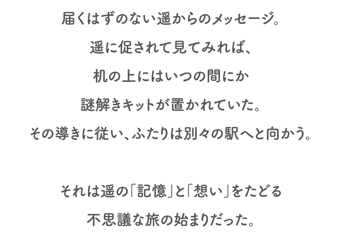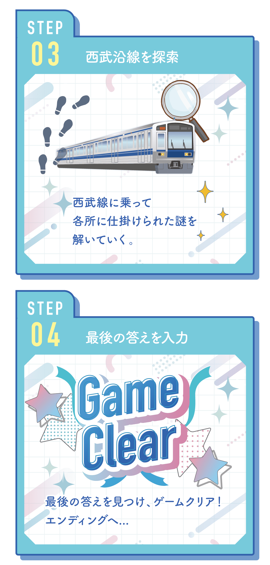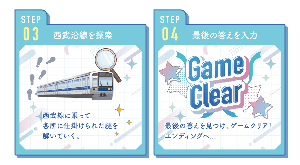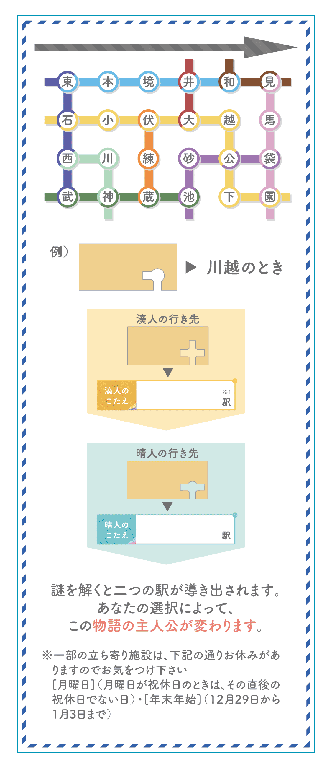 - ゲーム参加中、ホームや駅構内を歩行の際は安全に十分にお気をつけください。また、他のお客さまのご迷惑になるような場所での謎解きはご遠慮ください。