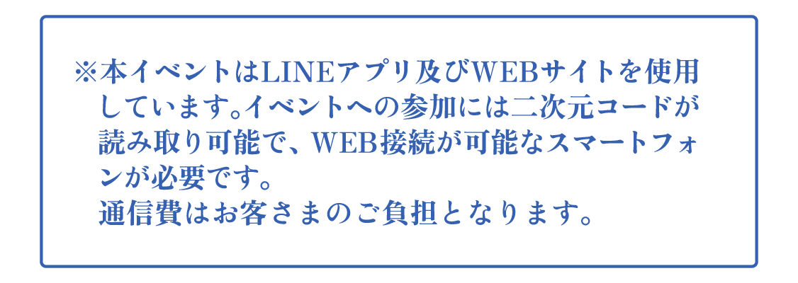 - ゲームにはLINEアプリを使用します。あらかじめアプリをご登録の上ご参加ください。また予備バッテリーをご用意いただくことをおすすめします。